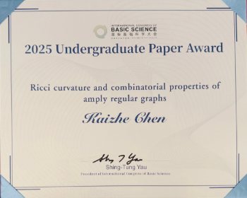 Seven recipients nationwide received the ICBS 2025 Best Undergraduate Paper awards. Chen Kaizhe, an undergraduate student from School of the Gifted Young (SGY), received this honor for his thesis titled “Ricci Curvature and Combinatorial Properties of Amply Regular Graphs,” completed under the guidance of Professor Liu Shiping at USTC. This ICBS award was established at the 2024 International Congress of Basic Sciences upon the proposal of Academician Shing-Tung Yau. It aims to encourage students to engage in original mathematical research during their undergraduate studies. It is particularly remarkable that Chen Kaizhe earned this achievement as a junior .